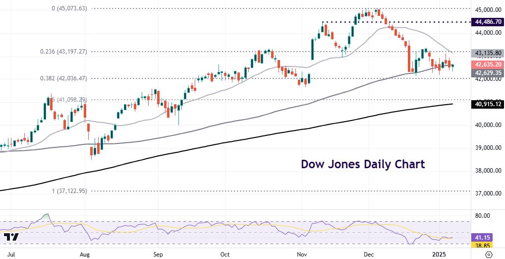 Technically, the Dow had a rough time in December falling over 5% and suffering 10 straight down days. Growth stocks ticked up while value stocks struggled. Prices are now trading around the 100-day SMA at 42,629. A major Fib level (38.2%) of the low to high move of 2024 sits at 42,036. The midpoint of that move sits just above 41,000. The index needs to get above 43,135 and 43,373 to resume the bull trend.
