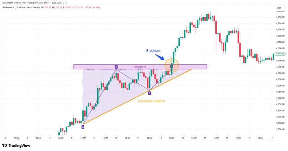 The ascending triangle pattern reflects this dynamic clearly: A horizontal ceiling of resistance where sellers repeatedly step in, and a rising floor of higher lows where buyers grow increasingly confident.