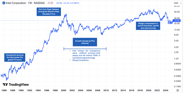 - 2000s-2010s Decline: Growth slowed as PCs matured. Intel missed the smartphone wave, suffered process-node delays, and fell behind TSMC in manufacturing technology.