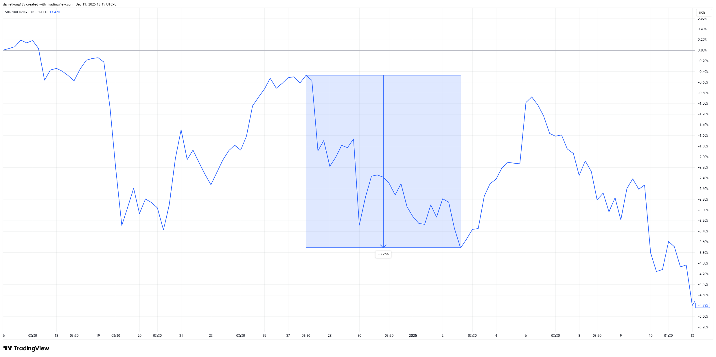By the traditional definition — the final five trading days of December and the first two trading days of January — the Santa Rally did not occur in 2024. The highlighted portion of the chart shows that the S&P 500 fell by approximately 3.26% across this seven-session window, marking a clear deviation from the long-term seasonal trend in which the period more often delivers gains.