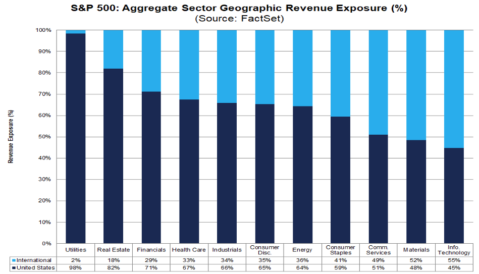 This is especially important for export-driven sectors like information technology (55% international revenue), materials (52%), and communication services (49%), where foreign income makes up nearly or more than half of overall revenue.