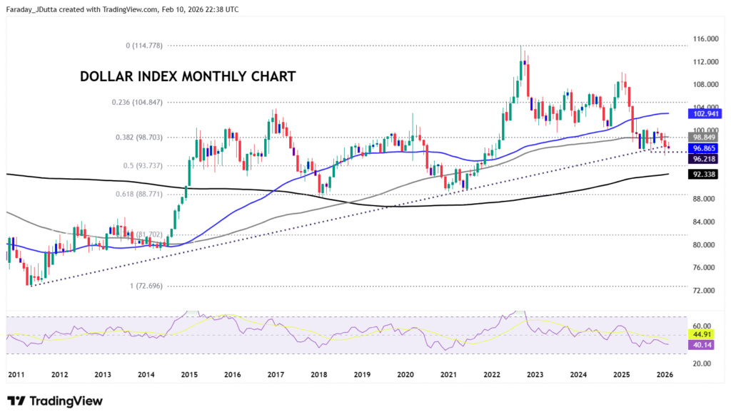 While the yen has hit the Dollar Index this week, all eyes are now on this week’s top tier data with NFP first up today.Importantly, the January FOMC statement removed the line that “downside risks to employment rose in recent months” while suggesting that there have been “some signs of stabilisation” in the unemployment rate. But many economists disagree with this assessment, as just three sectors are providing the bulk of job gains in the last year or so. Without these, there would have been job losses. US Treasury yields have turned lower this week following last week’s other soft job market figures. Fed rate cut bets have increased with more than two 25bps moves now priced in for 2026. The DXY is trading between a long-term bullish trendline and the cycle lows from September 2025 at 96.21. The recent near-4-year low is at 95.55 with the next big retracement level below at 93.73. Long-term topside levels sit at 98.70 and 98.84.