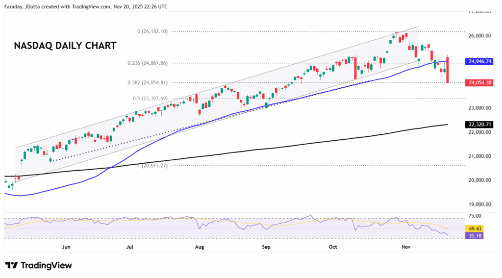 With Nvidia’s weighting around 10% in the tech-heavy Nasdaq, it’s no surprise that its earnings would have a huge influence on where the index goes, as we have stated previously. Prices have fallen close to  8% from the record high print at 28,182 from late October, and out of the bull channel seen since mid-May. This series of higher highs and higher lows was also supported by the 50-day SMA which has been broken recently. That currently sits at 24,946. Yesterday’s intraday price action looks bearish with the gap higher on the open quickly being filled and the index falling sharply. That has seen a big bearish engulfing candle print, with a major Fib retracement level (38.2%) of the May to October rally at 24,054. The midpoint of that move sits at 23,397.