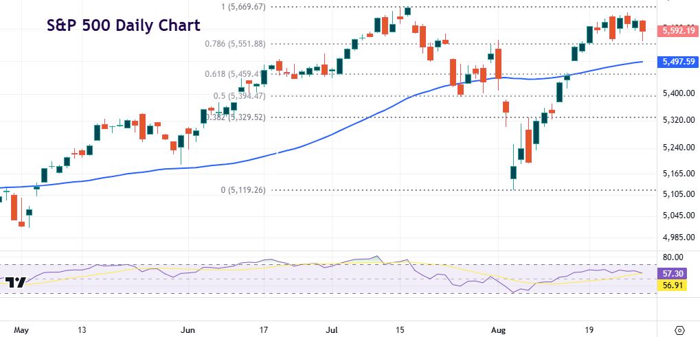 As we highlighted above, courtesy of research from an investment bank, where Nvidia goes so too goes the benchmark wider market index. That means the blue-chip S&P 500 could rolls over after struggling to push higher up to the record high in July at 5,669. Prices had been hovering just below here and will now look to the Fib retracement level (78.6%) of the August rebound at 5,551 for initial support. Below here is the 50-day SMA at 5,497 and then the next major Fib level (61.8%) at 5,459.
