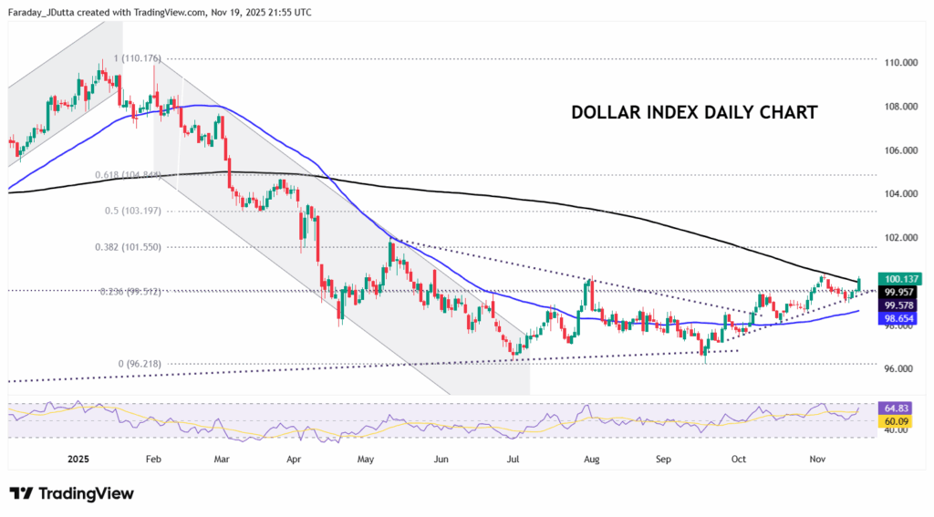 FX: USD broke higher and hit the 200-day SMA at 100.29. This capped the upside earlier in the month at 100.36. Rate cut expectations were pared back after the BLS schedule showed that the Fed won’t see the November or October US jobs data before the December FOMC meeting. Money markets predict a one in three chance now of a 25bps rate reduction, versus a 50:50 chance on Tuesday. The FOMC minutes added little new but emphasised how divided the committee is. The greenback was modestly bid on the release as ‘many’ officials were expecting no change in December.