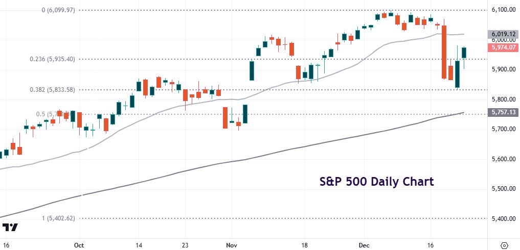 Regarding the Santa Rally, markets increase in value specifically during the last week of December and into the first two trading days of the new year. Research shows that since 1950, this single seven-day period has produced a positive return for the S&P 500 78.9% of the time. No other similar duration of trading sessions is more likely to be higher. After the tumult from last week’s Fed meeting, prices have bounced off a Fib level (38.2) of the September low to the record high, at 5833. There’s a minor retracement level at 5935 ahead of the 21-day SMA at 6019.