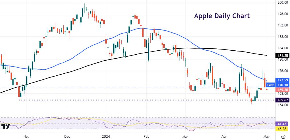 Apple report its Q2 earnings after the US closing bell. Revenues of $90.6bn are expected, which would be a year-on-year decline of 4.5%. The prior quarter saw revenues beat estimates, rising 2%. The foucs will be on iPhone revenues which are forecast to be “similar” to last year. Market will focus on sales in China, Apple’s second largest iPhone market and the sales outlook. Any commentary on AI will also be crucial. This comes after  CEO Cook’s said on the previous earnings call that AI initiatives were coming later in the year.