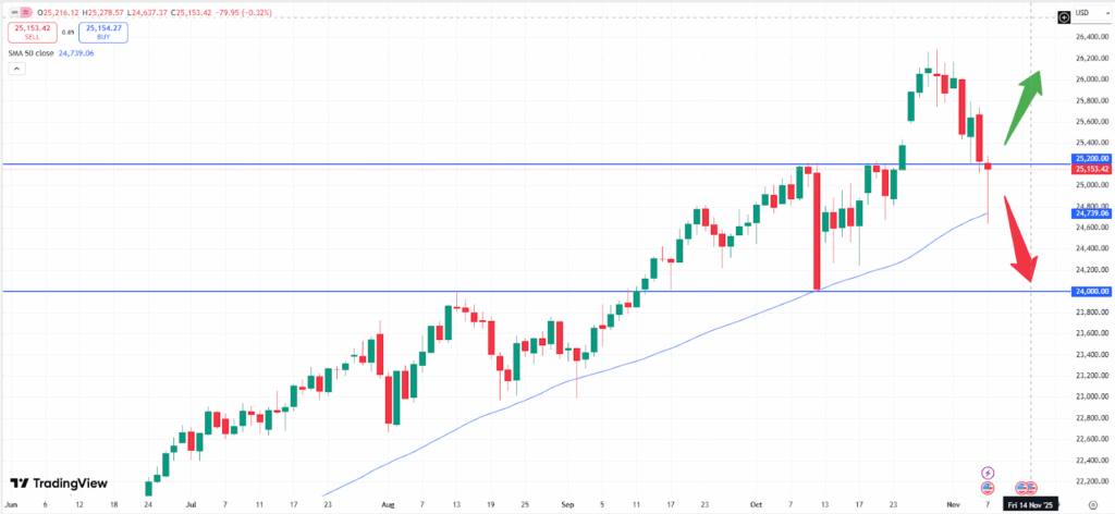 The NAS100 index shows that the market retraced last week. Traders should now pay attention to the important support zone of 25.200. A clear break of this level might indicate that the market will start to correct further. The market might then try another attempt towards the 24.000 price range.