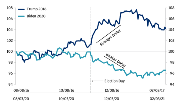 过去两次选举对美元的强势产生了明显的影响,如下所示: