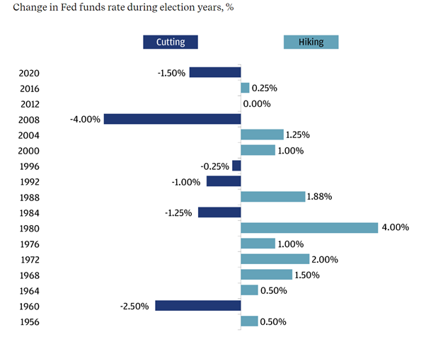 下面的图表详细列出了美联储在选举年实施的所有利率变化: