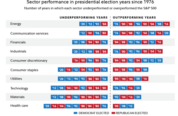 根据 1976 年以来的数据,不同行业的表现都有一定程度低于或高于标准普尔 500 指数。无论总统是民主党人还是共和党人,这都是如此。