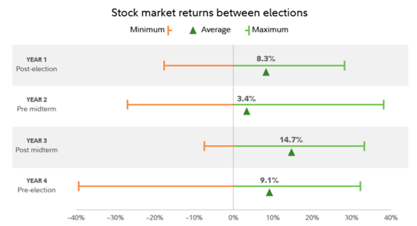 根据富达的数据,自 1950 年以来,标准普尔 500指数在选举年的平均回报率为 9.1%。考虑到美国股市历史上长期上涨,这一结果并不奇怪。