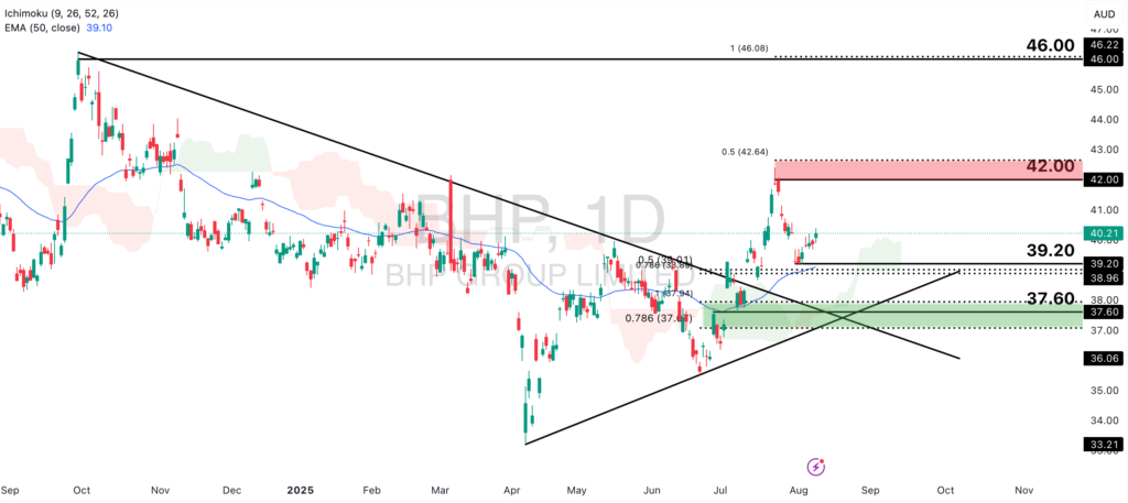 BHP’s stock price has recently seen a bullish breakout above the descending trendline resistance, and is now holding above the Ichimoku cloud and 50-EMA, indicating that bullish momentum is in effect. As the price continues to hold above the $39.20 swing low support, we could see a further leg to the upside, towards the $42.00 swing high resistance, in line with the 50% Fibonacci Extension level.