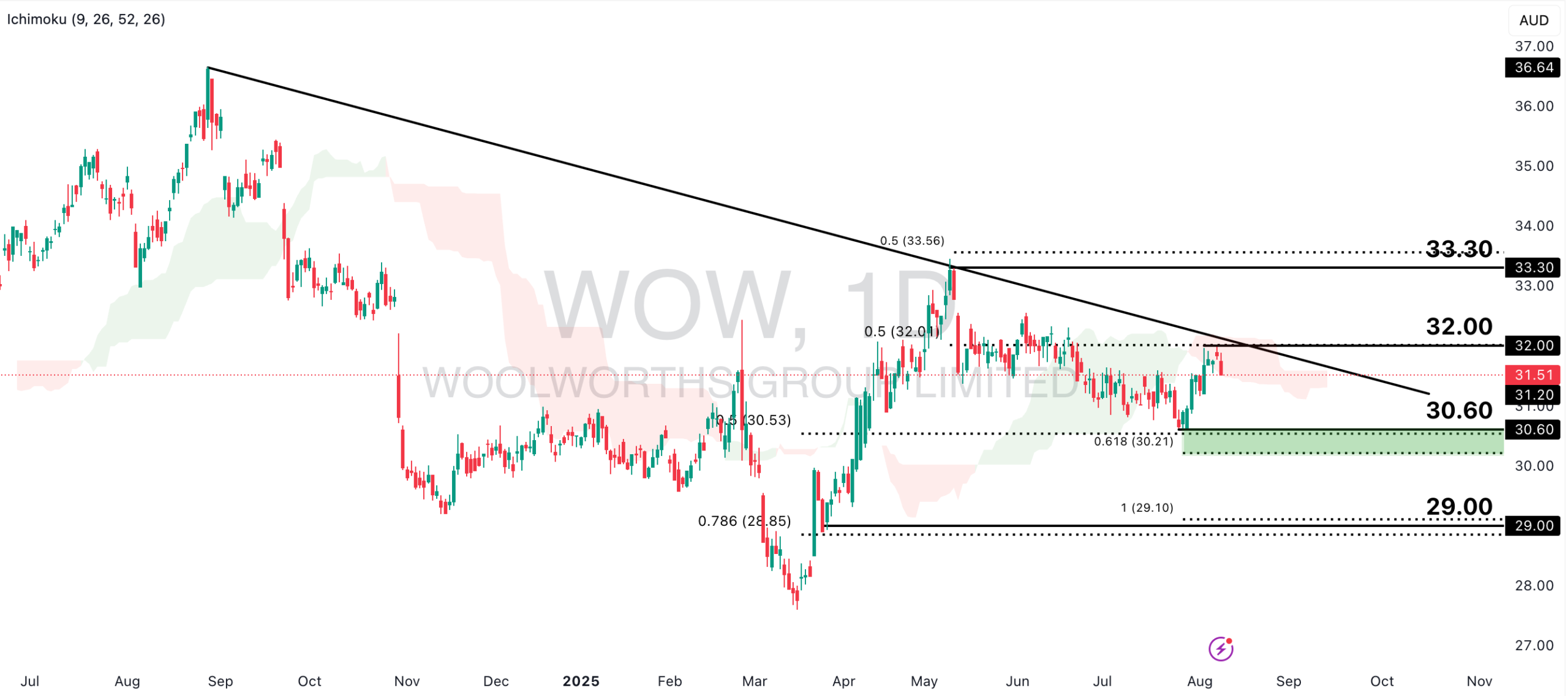 WOW’s stock price is testing both the descending trendline resistance and Ichimoku cloud. A rejection at this level could mean that bearish momentum continues to hold, and the price could push lower towards the $30.60, in line with the 50% Fibonacci Retracement and 61.8% Fibonacci Extension levels, and even further towards the $29.00 support level.