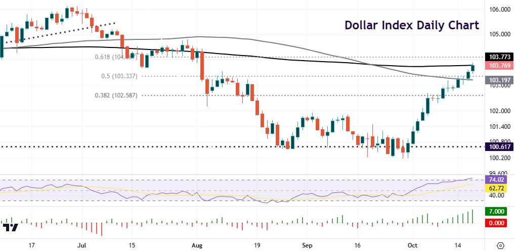 The Dollar Index has posted seven straight days of gains, which hasn’t been since April 2022. Prices are through the 50% recovery of the year-to-date high to low at 103.34, with the 200-day SMA just above at 103.77. The next upside level is the 61.8% mark at 104.08. Prices are overbought on the daily RSI and outside the upper Keltner band, so warning of a correction.