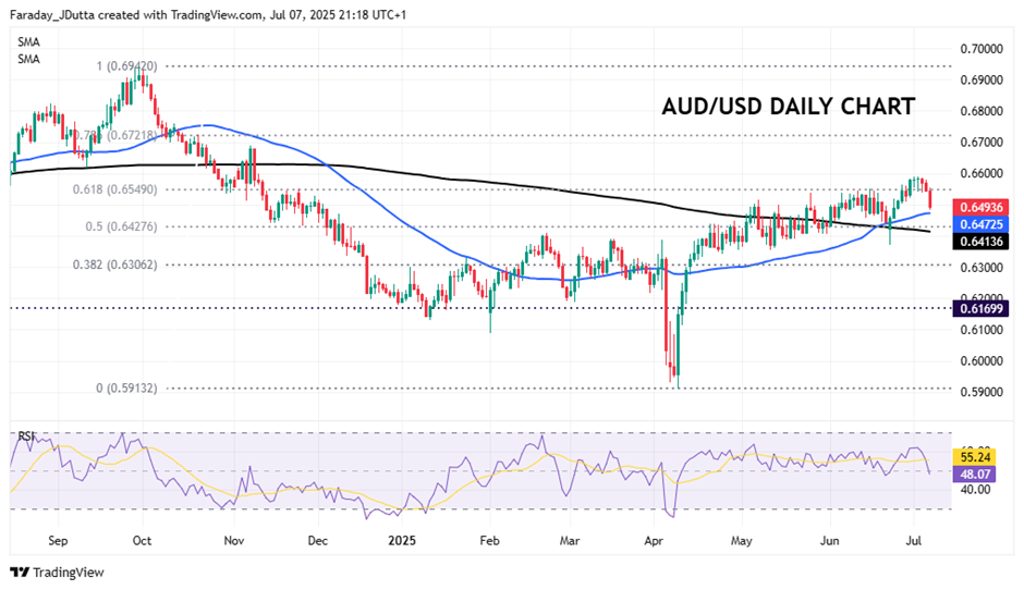 The major recently broke to the upside after hitting resistance around the major Fib retracement level (61.8%) of the September 2024 to April 2025 move lower at 0.6549. But it could be a false break as 0.66 wasn’t pierced and prices rolled over on Monday, the third straight day of selling, with the aussie underperforming all other major currencies apart from the yen and kiwi. Initial support sits at the 50-day SMA at 0.6472 and then there’s a zone of support with the midpoint of that long-term move at 0.6427 and the 200-day SMA at 0.6413. A grudging message about the rate cut could underpin support for the aussie, albeit with trade war announcements also crucial.