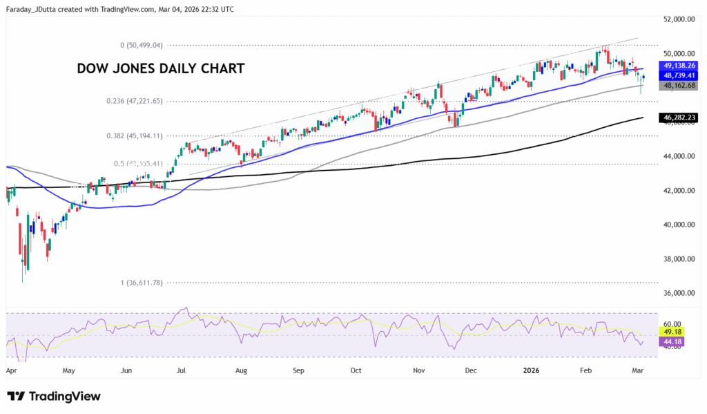 The Dow slid to levels last seen in early December on Tuesday and below the 100-day SMA at 48,162. But a bullish hammer candle formed, as we pointed out, and ‘Turnaround Tuesday’ saw modest gains as markets steadied amid the Middle East tumult. Prices still remain below the 50-day SMA at 49,138 and the index has modestly underperformed the Nasdaq this week with battered Tech doing better than more traditional defensive sectors which had previously been doing well. The Dow needs to get above the 50-day SMA and preferably the late February top at 49,815 to reassert some bullish momentum.