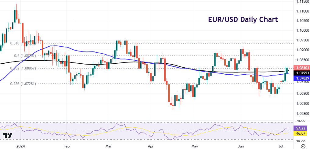 EUR pushed higher and closed above 1.08 and its 200-day SMA at 1.0794. Focus is on NFP but then the second voting round in France on Sunday.
