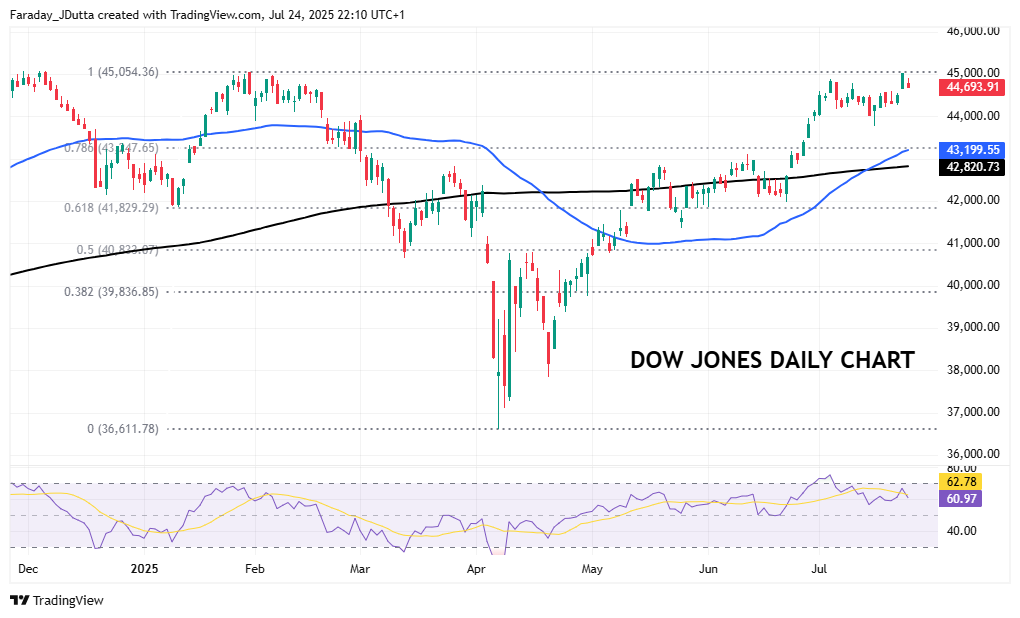 US stocks: The S&P 500 printed up 0.07% at 6,363, another fresh record closing high. The Nasdaq settled higher, by 0.25% at 23,220, also a new all-time closing top. The Dow Jones finished down at 44,694, losing 0.7%. All sectors were in the red except for Energy, Tech and Communication Services. The tech-heavy Nasdaq was buoyed by Alphabet and broad-based G7 strength, while the small-cap Russell 2000 (-1.4%) lagged and pared some of its weekly gains. The two tech titans, Alphabet (+0.9%) and Tesla (-8.2%) saw contrasting fortunes, and as such, Communications and Consumer Discretionary sat as the respective out/underperforming sectors. Materials was the next laggard, hit by Dow’s (-17.5%) dismal report. Tesla was hit by Elon Musk’s ‘rough few quarters’ comment, with the EV-maker in a transitory period as it evolves from an EV leader into a future tech (AI and robotics) leader. Alphabet displayed its wide moat with a booming cloud division and a search business that is still delivering, with 90% of global share.