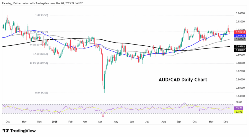 Gains in this popular pair extended above the ceiling of the recent range that has prevailed for the cross since mid-September. After a period of range trading between 0.9060 and 0.9240, the bullish move in some daily momentum indicators suggested a more dynamic phase of price action may develop. But a break to a new, higher range between 0.9250/0.9375 failed. The current range ceiling at 0.9240 remains major resistance now. Prices have fallen back to the 50-day SMA at 0.9148 and below a Fib retracement level (73.6%) of the September 2024 high to April 2025 low at 0.9174.