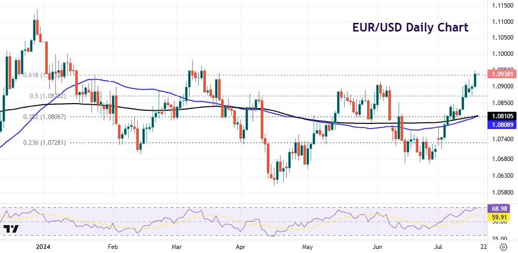 A pushback on a “normal” rate cutting cycle, perhaps a “hawkish hold”, could boost the euro and push it decisively beyond the March highs at 1.0981 and beyond. But explicitly lining up another rate reduction in September could hit the single currency.