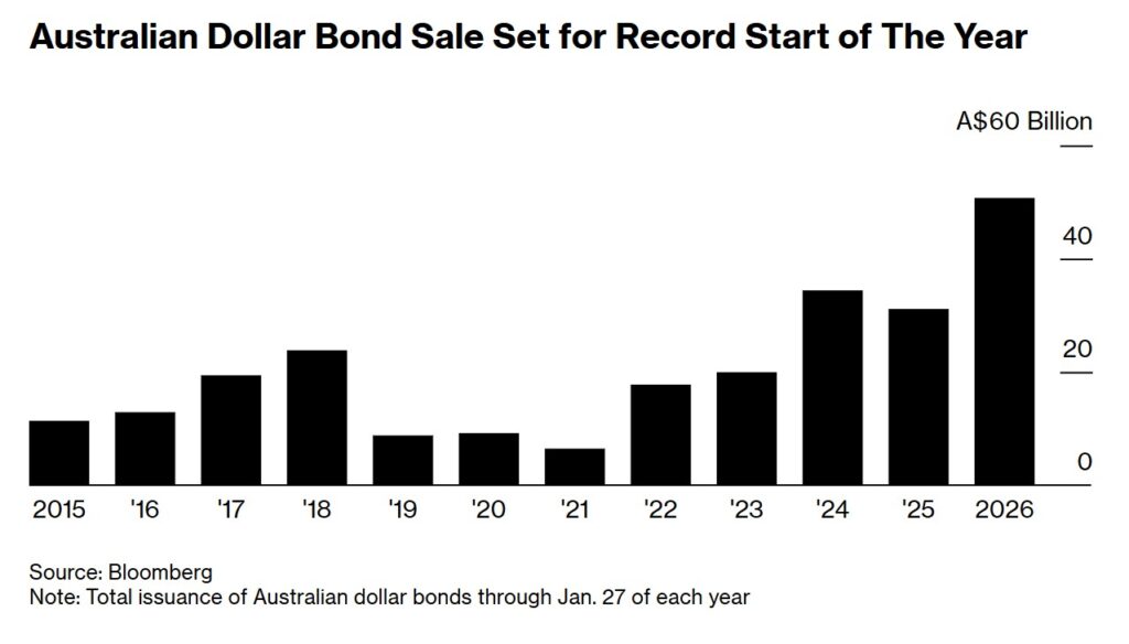 Capital flows rarely lie. Australian dollar bond issuance has surged to record levels early in the year, up more than 60% from a year ago. That partly reflects expectations the RBA may keep policy tighter for longer, but it also signals a broader shift as global investors diversify away from US-dollar exposure toward Australia’s low default risk and relative stability.