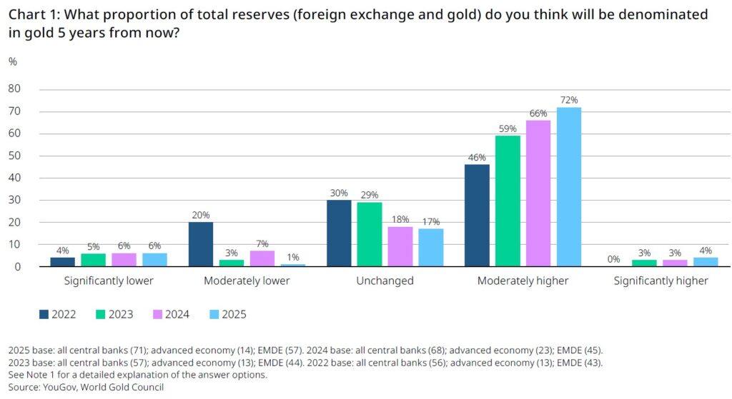Long-horizon central banks are a good place to look. Over the past decade, they have been consistent net buyers of gold and continue to signal a desire to lift gold’s share in reserves relative to the US dollar — even as prices sit near record highs. Recent central bank surveys show that more than 70% of central banks expect demand for gold reserves to rise further over the next five years.