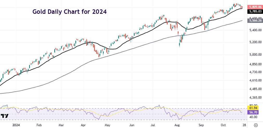 The 21-day SMA is as good an indicator as any for support in a strong bull trend. That resides at $2669, near the September high at $2685. As wrote last time when commenting on gold, “an ascending channel has developed and…the Middle East tensions saw more haven buying. Last week’s record high at $2685 is in sight and waiting to be conquered.”
