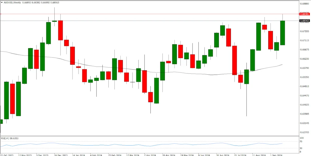 Based on the weekly chart above, in the previous week, AUD/USD surged by +117 pips, hitting a weekly high of 0.68387, largely driven by the Fed’s 50bps rate cut to 5%. The 50- period MA crossover indicates a bullish trend, but AUDUSD faces resistance at 0.6840, last tested in December 2023. A break above this level after the RBA’s rate announcement could signal further upside potential indicating a strong AUD, while a rejection could trigger a downside reversal indicating a weak AUD. The RBA will reveal its interest rate decision on September 24, 2024, at 6:30 CET.