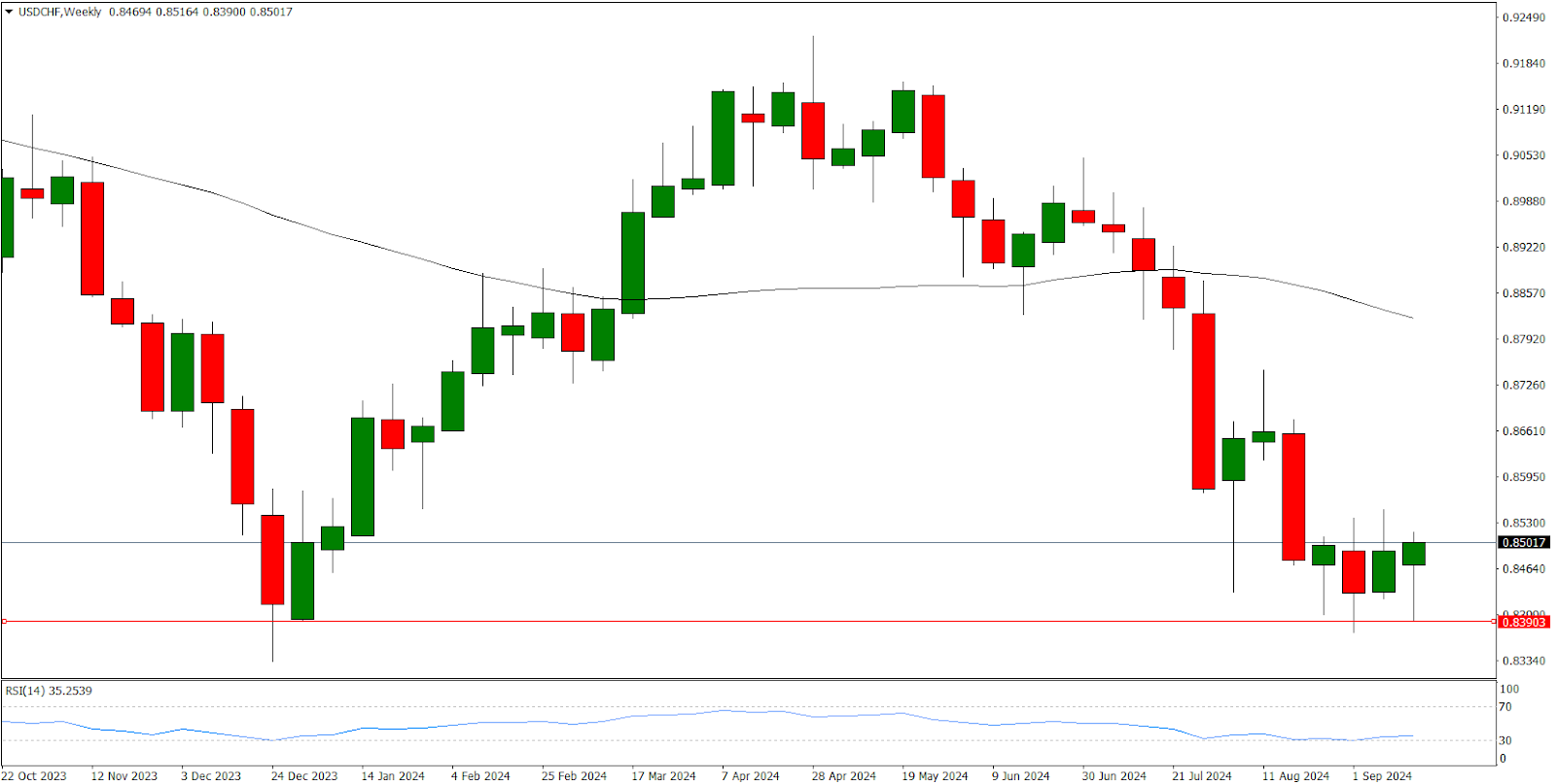 Based on the weekly chart above, last week, USDCHF rallied, adding 31 pips peaking at 0.8520 marking the week’s key support level after the Fed’s 50 bps cut. Although the pair trades below the 50-period MA, signaling potential downside, the key support at 0.8390 forming an uptrend since December 2023. A break below the support on the SNB’s potential rate cut could reinforce CHF strength, but a support bounce could shift momentum, signaling CHF weakness. The interest rate decision will happen on September 26, 2024, at 9:30 CET.
