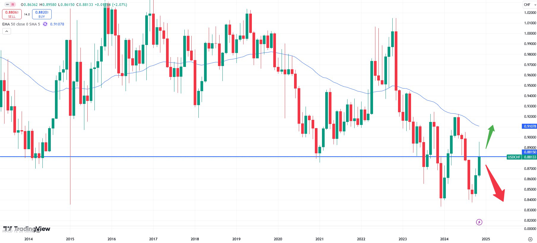 We now take a look at the USDCHF currency pair. Seasonal figures show a 70% bearish probability towards the end of the year. Based on the monthly chart above, the market might be ready to weaken. The market kept falling off the strong resistance zone. If the area is not be broken to the upside the recent falling trend, which is also confirmed with the 50- moving average in blue color, the slide might continue. Prices could then be ready to move towards the 0.8400 price zone. The data will be announced on Tuesday, December 03 at 08:30 CET.