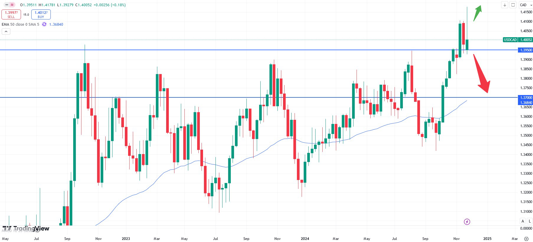The USDCAD currency pair shows a strong retracement off the weekly chart above. This might indicate that the price of the Canadian is gearing up momentum, causing this pair to proceed lower. A potential target might be the area at 1.3700 as the long- term chart suggests. Only a break above the highs near the 1.4100 area might offer further upside potential again. The data will be published on Friday December 06 at 14:30 CET.