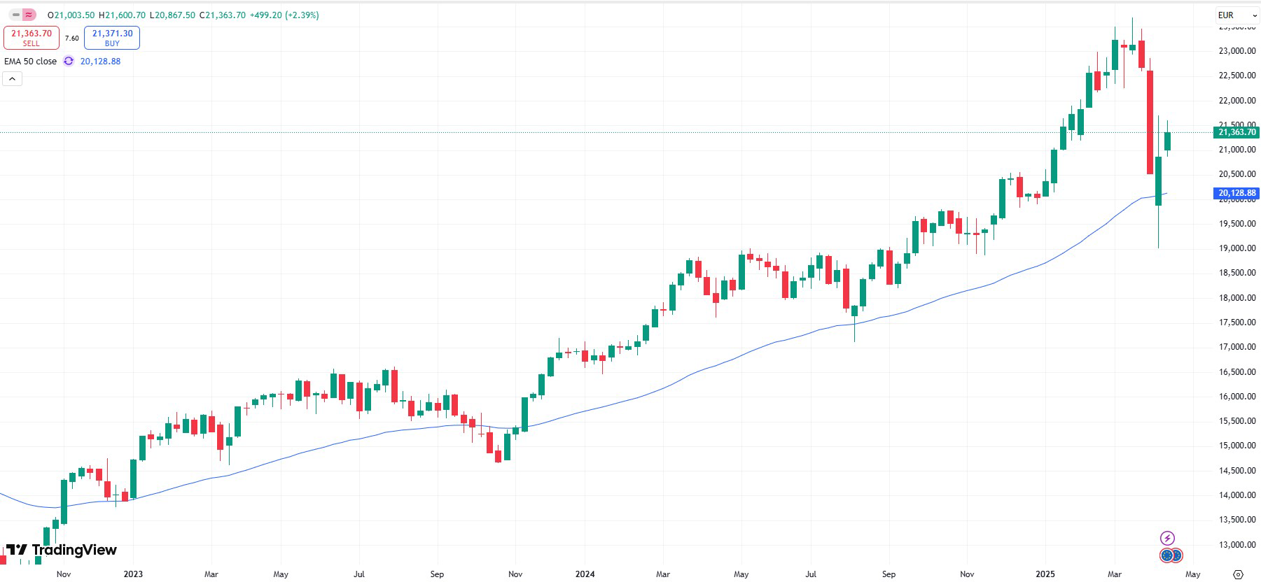 Based on the weekly chart above the market continues to bounce off the 50- moving average, signalizing further upside potential. The positive sentiment might increase above the 22.000 level and a better than expected reading could intensify this trend. The PMI index will be published on Wednesday, 23 April at 09:30 CET.