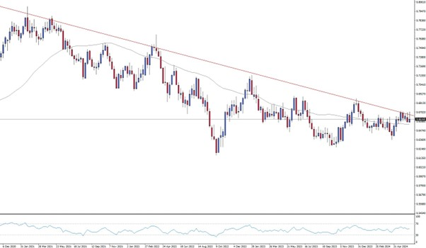 The weekly chart of the AUDUSD illustrates this trend. The downtrend might intensify below 0.6565, close to the 50- moving average. On the other hand, the AUD could also rise in particular against the EUR.
