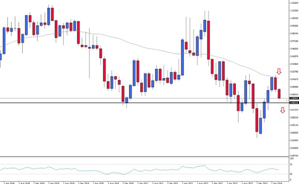 The weekly chart is currently showing further downward pressure, as the 50-moving average previously limited the market. If the support zone at 0.8830 will be broken, there could be renewed potential for the CHF. The interest rate decision will take place on Thursday, 20 June at 09:30 CET.