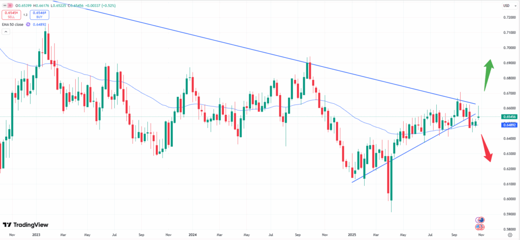 The weekly chart above shows, that the price tried to break higher last week but, in the end, failed to break to the upside. The technical pinbar candlestick pattern might now cause the AUD to weaken. Prices below 0.6500 level could be used as an entry, while a break of the 50- moving average at 0.6490 might indicate a further slide. The AUDUSD currency pair might then move towards the 0.6200 price range. The data will be released on Tuesday, the 02nd of November at 04:30 CET.
