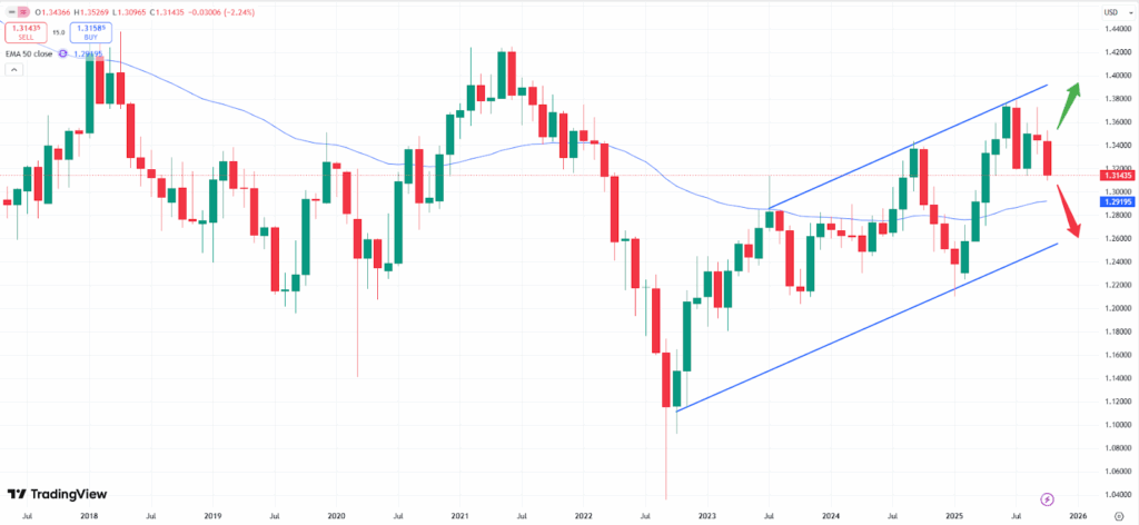 A closer look at the long-term monthly chart of the GBPUSD currency pair reveals that the price went lower, especially during last the last trading week. Since the positive risk sentiment also in the equity market keeps fading, the Pound is losing some momentum. With the break of the recent low at 1.3200 from three months ago more downside momentum might now follow. Slightly rising prices could then be used to enter the market on the selling side. Given the trendline in the chart above potential targets could be found, should the Dollar continue with its strength for now. The interest rate decision will occur on Thursday, the 06th of November at 13:00 CET.