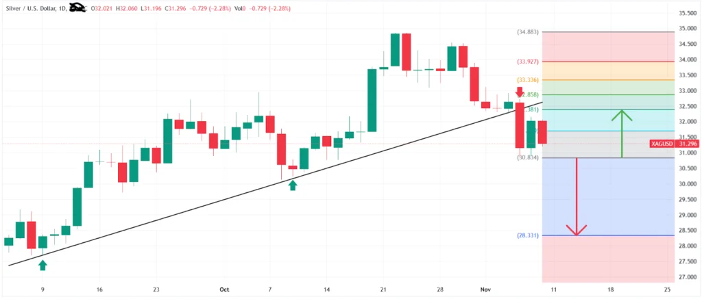 Wednesday saw silver prices drop to around USD 31.50 per ounce, marking a near three-week low, pressured by a stronger USD following early exit polls showing favorable results for Trump. This fueled renewed “Trump trade” optimism, driving market sentiment and weighing on safe-haven assets like Silver.