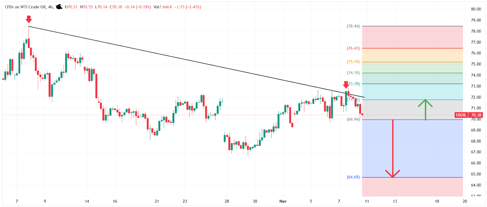 4-hour charts show, that USOIL was rejected at the downtrend line near USD 71.76, currently at USD 70.38 USD. If rejection holds, a decline to USD 64.70 USD might be likely.