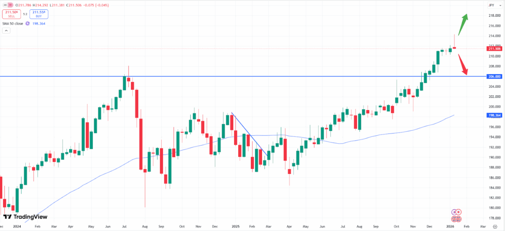 Based on the weekly chart above the GBPJPY currency pair did not move higher. The USDJPY and EURJPY currency pairs also offer the same insights. The technical pinbar candlestick pattern might now offer fresh downside momentum in this market. Though, this would be against the general trend, corrections like this might still occur and push the market lower for some time. The slide in prices might then intensify if the market trades below the 210.00 zone. As a target the 206.00 could be found, where the market back July 2024 acted as a resistance level, now potentially turning into a support zone. The rate decision will be held on Friday, 23rd January.